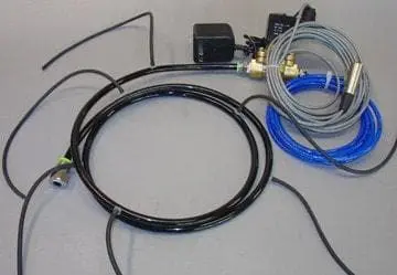 Kit includes 12V DC valve, 6.5′ supply hose, six 14″ whips, hand held controller with 12′ of wire and air supply hose w/ 1/4″ NPT male fitting. Requires 110V power and a compressor with 100-120 PSI.