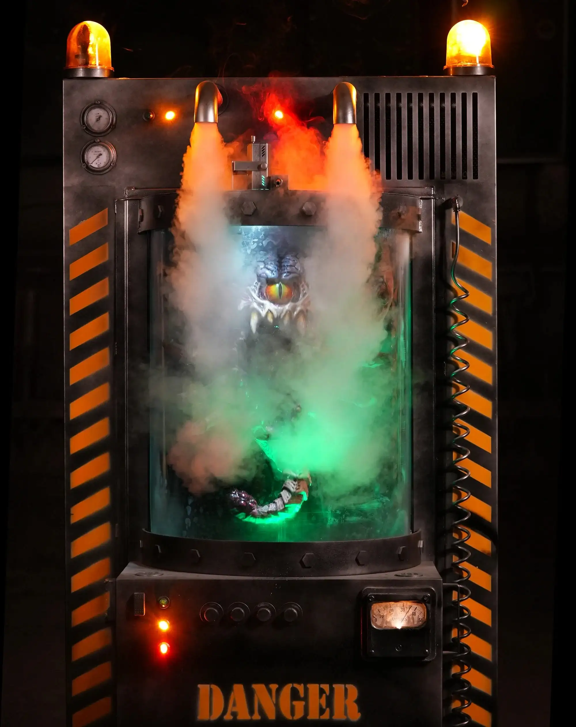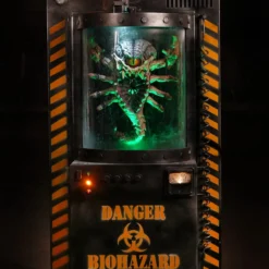 Alien Parasite is a scary and high-impact animatronic! A captured alien parasite moves and shakes inside its high-tech containment unit, and appears to be safe behind solid plexiglass and metal. Suddenly you hear an alert! “Systems Failing, all personnel evacuate immediately.” Emergency lights go off as the unit shrouds in fog. You gaze into the fog and just when you begin to breathe a sigh of relief that the alien is still contained…IT BREAKS FREE, jumping forward at you, creating a tremendous scare!