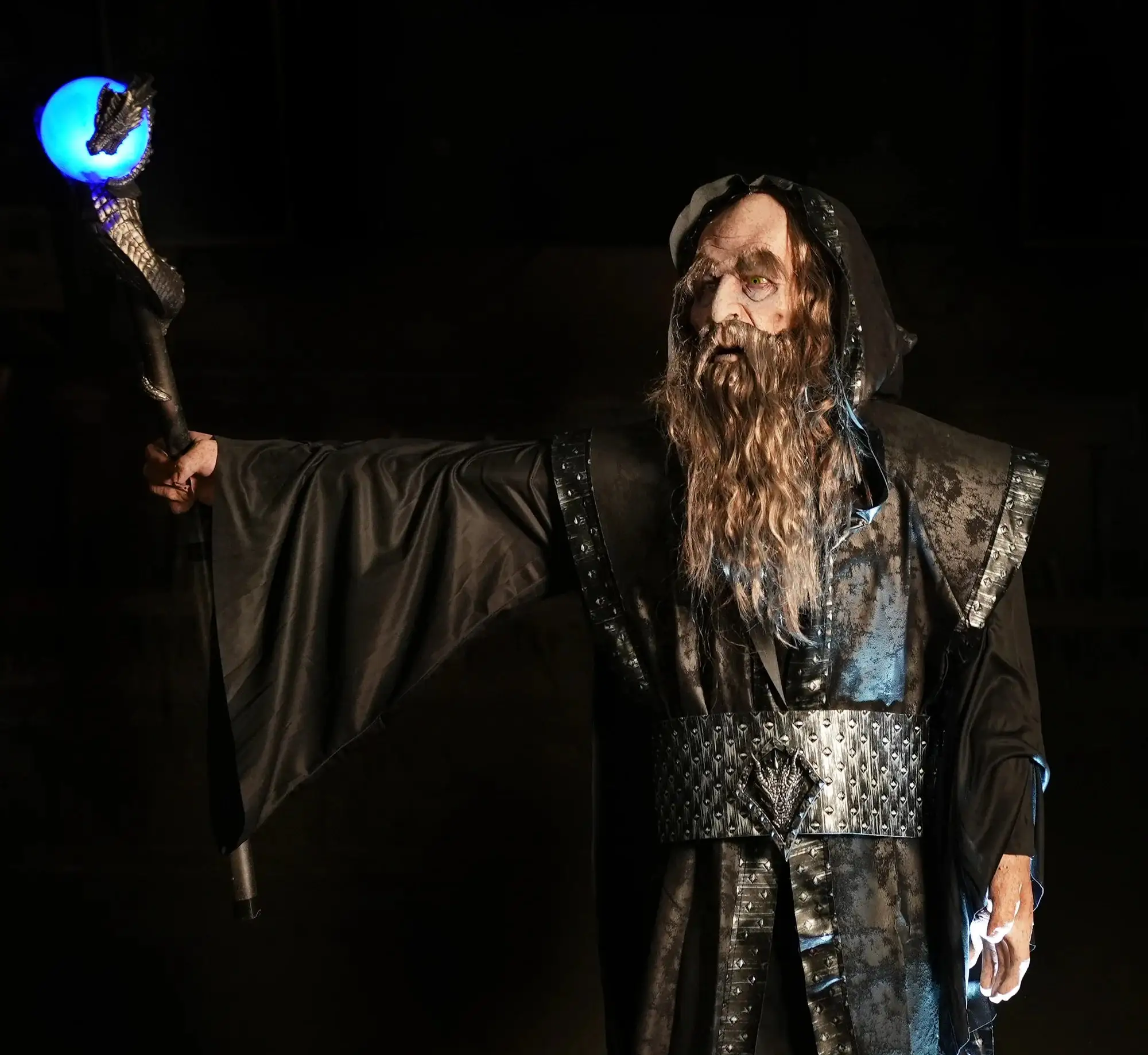 This professional Ancient Wizard talking animatronic is suitable for theme parks and haunts. The Ancient Wizard has an audio program with a moving mouth, head and arms. Lightning, a glowing staff, and fog add to the dramatic effect.Â