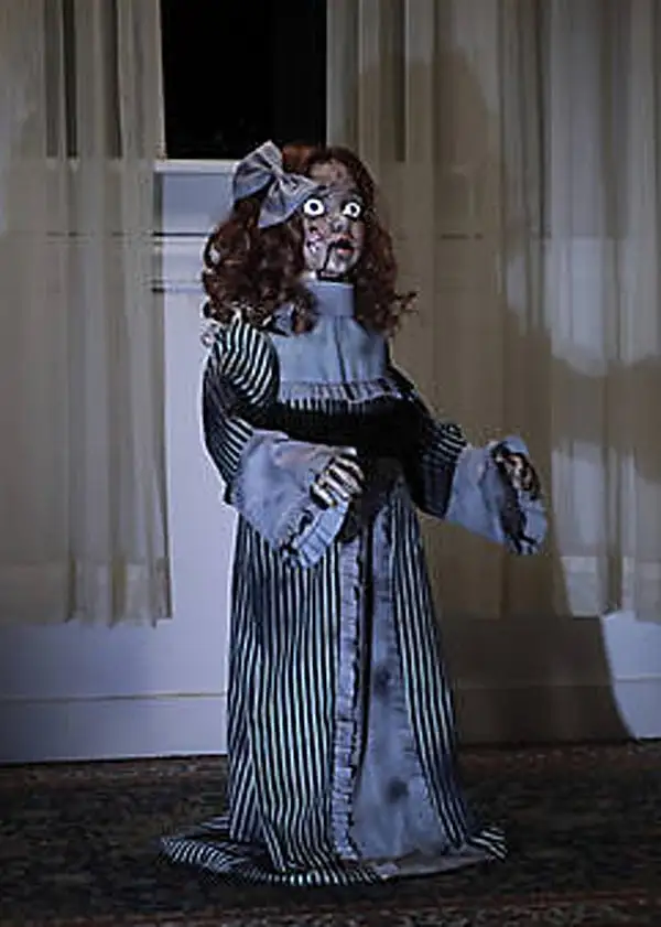 The eerie Music Box lullaby playing in the background sets the scene for this 36-inch Vintage Animated Doll Prop to scare you to death! Her Head Turns side to side and her Arms Move forward and back while her Mouth Moves with her spooky sayings:Phrase One: “(Giggle) Can’t find your friends? Don’t try to find them – they’re with me now.”Phrase Two: “I like to watch you when you are sleeping. Don’t worry, I’ll stand right next to your bed.”Phrase Three: “The man at the store said you shouldn’t have brought me home. You were warned (giggle)!”The 36-inch Vintage Animated Doll Prop has an injection-molded and blow-molded plastic frame with bendable wire arms and a fabric antique-looking costume. On has a sensor activation, and off position has a Try-me activation. Requires 3 AA Batteries, not included.