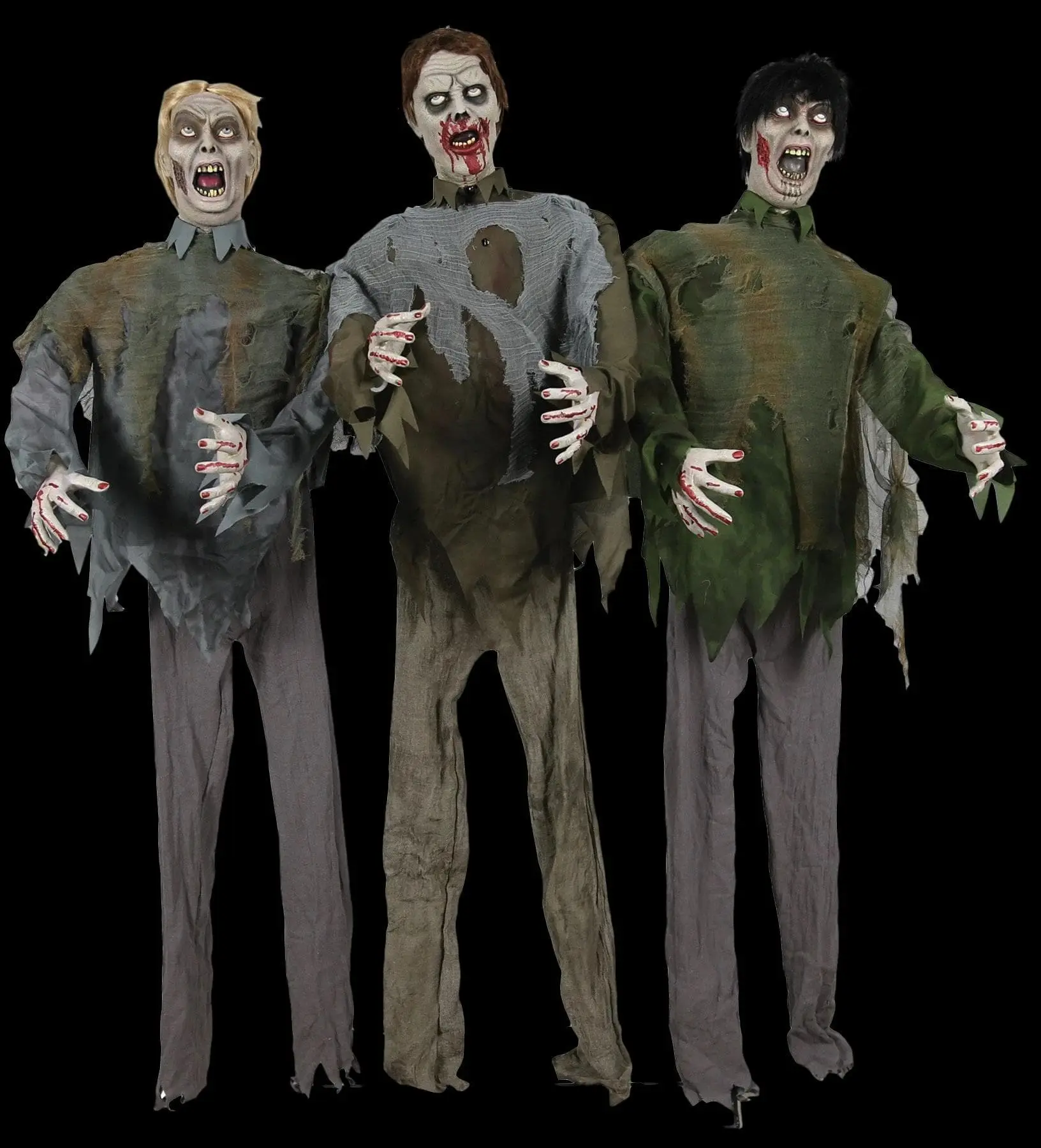 Now you can have a whole horde of zombies at your door or on your porch with The Zombie Horde! These three 6′ Zombie characters have roto-PVC heads with light-up eyes, dirty fabric costumes with shredded-gauze accents, posable arms with plastic “blood-splattered” hands, and an easy-to-assemble frame. Plug in the UL power adapter into any standard outlet & choose from Steady-On, Infra-Red Sensor or Step-Here Pad (included) activation options to operate. Once activated, the Zombie Horde will begin moaning as their eyes light up with an other-worldly glow as each zombie sways from side to side, hungry for your brains! The infra-red sensor works from bright light to no light! Item includes volume control. Easy-to-assemble quick-connect poles. Assembly required.
